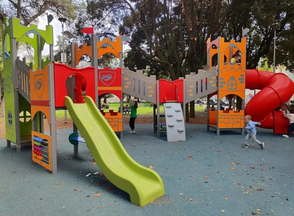 Questo rappresenta il quarto spazio ludico che è stato completamente rinnovato dall'amministrazione Mastrangelo nel corso degli ultimi venti mesi. L'elemento centrale di questa nuova area è un magnifico castello con quattro torri, dotato di due scivoli, due piattaforme di risalita e un ponte pedonale. Questo moderno luogo di aggregazione, ubicato in uno dei principali parchi della città, occupa una superficie di circa cinquecento metri quadrati. L'area è stata progettata con un forte focus sull'inclusione sociale, garantendo l'accesso e il divertimento anche per i bambini con disabilità.
